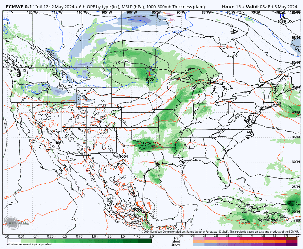 We have two beautiful days ahead of us with the only minus being some persistent clouds, but Sunday I'm afraid will likely bring some rain to all open ski areas. It doesn't look like a total washout and I'll send an Alert out probably Saturday to help refine the timing and scope of the rain for Sunday. Let's take a look at the broad view from the ECMWF using 6-hour precipitation intensity covering all of Friday through Sunday.