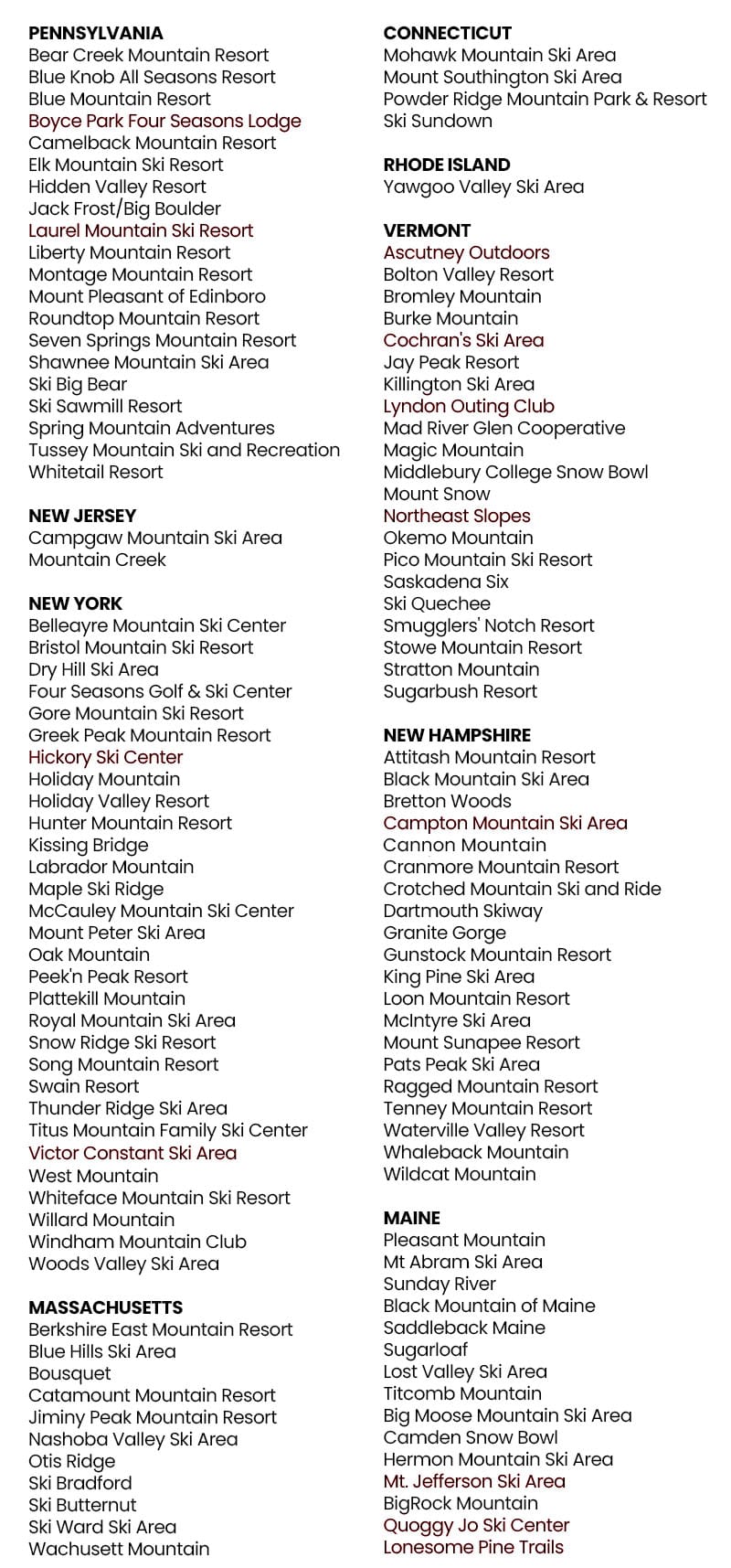 With the launch of the ski weather app capabilities in Phase 1 we will also be expanding coverage to more ski areas! The following list contains every ski area that has at least a T-bar or chairlift, 50 acres of terrain, and is open to the general public on weekends. We are uncertain about whether we will include about a dozen smaller ski areas as they do not report their operational data to the industry's aggregator of that data which is less than optimal and I have highlighted those in maroon to indicate that they are uncertain. Those ski areas of course primarily serve their local communities. We may expand coverage into other areas of the East Coast over time as well.