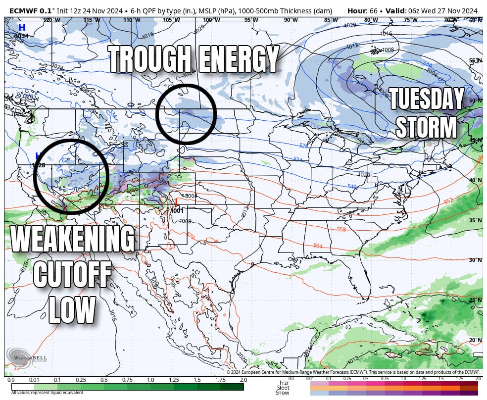 On Tuesday morning the ECMWF sees these two pieces of energy "phasing" together and that creates a surface storm in the Midwest that would then track near the Northeast coast and create at least a moderate intensity coastal storm, but likely not huge. In this scenario snow is not very likely along the heavily populated corridor from Boston to DC, though wind and rain can be issues for travel of course.