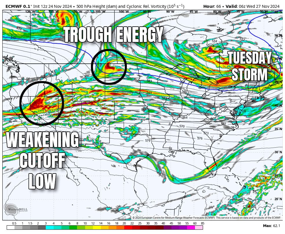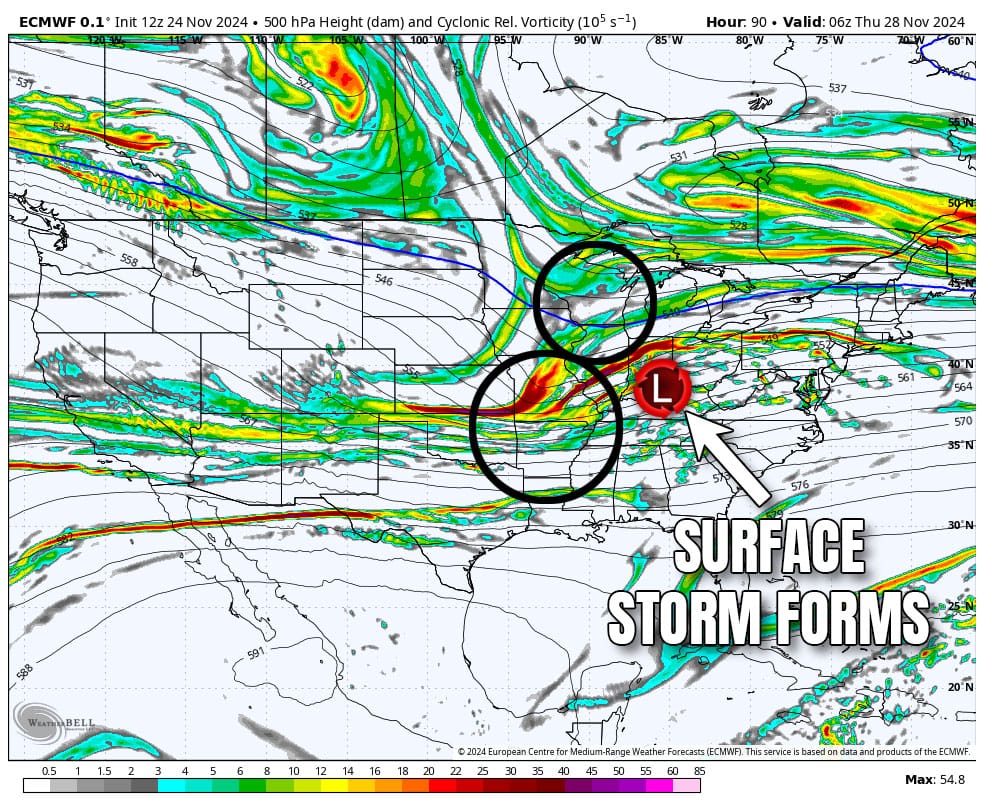 Now we're going to look at the same weather but using something called "vorticity" in the mid-levels of the atmosphere. It's easiest to just think of vorticity as energy in the atmosphere.