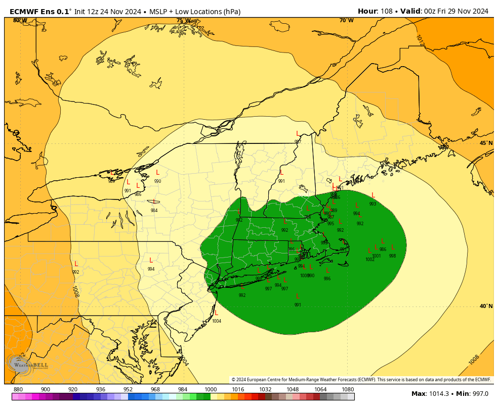 The ECMWF has a notable and repeatable bias where it over-amps Northeast coastal storms generally from 3+ days out. Not all storms, but in this setup, yeah, that bias likely at work here. So when we have disagreement like this with virtually no support in the GFS, my confidence is lowered greatly and that's why I'm giving a big coastal storm a 40% chance right now, however there is also the potential of more isolated moderate snow and also the possibility of some notable lake effect and upsloping snow behind this system even if it isn't a "bomb cyclone". There could also be a storm that comes a day or two later from a different combination of elements.