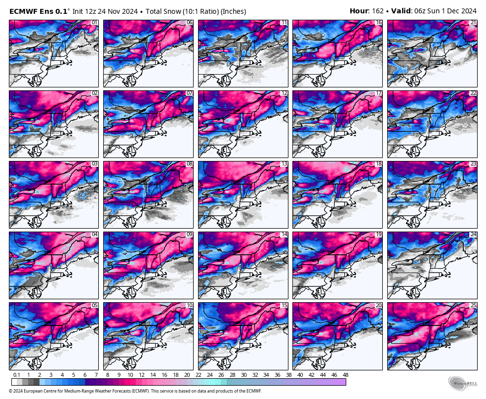 Here's what the ECMWF ensemble members show as of this afternoon for low locations of each ensemble member on Thursday evening as well as what 25 of the 50 ensemble members snow totals through Saturday. This would certainly be classified as very strong confidence, especially for this range, with about 2/3 of the ensemble members seeing a big storm.