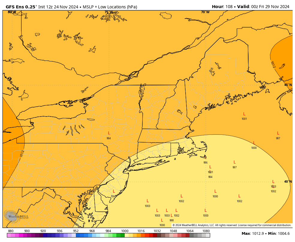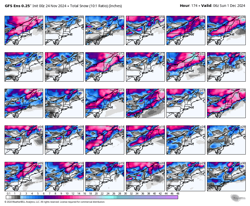 And then there are the GFS ensembles. Here's what all 30 ensemble members show as of this afternoon for low locations of each ensemble member on Thursday evening as well as snow totals through Saturday as well. I would also classify this as strong confidence of there not being a big coastal storm with only about 20% of ensemble members seeing a larger coastal storm. A big storm is certainly not off the table though.