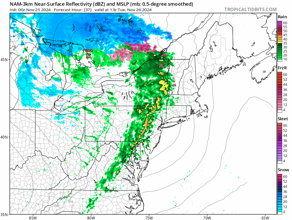 We have a system that is moving through Ontario and into Quebec on Tuesday that puts us on the warm side of the system with a low level jet (the rain shield) trailed by a cold front that is passing through the Northeast during the Tuesday ski day. Here's the simulated radar showing the precipitation types between 8AM and 4PM on Tuesday.