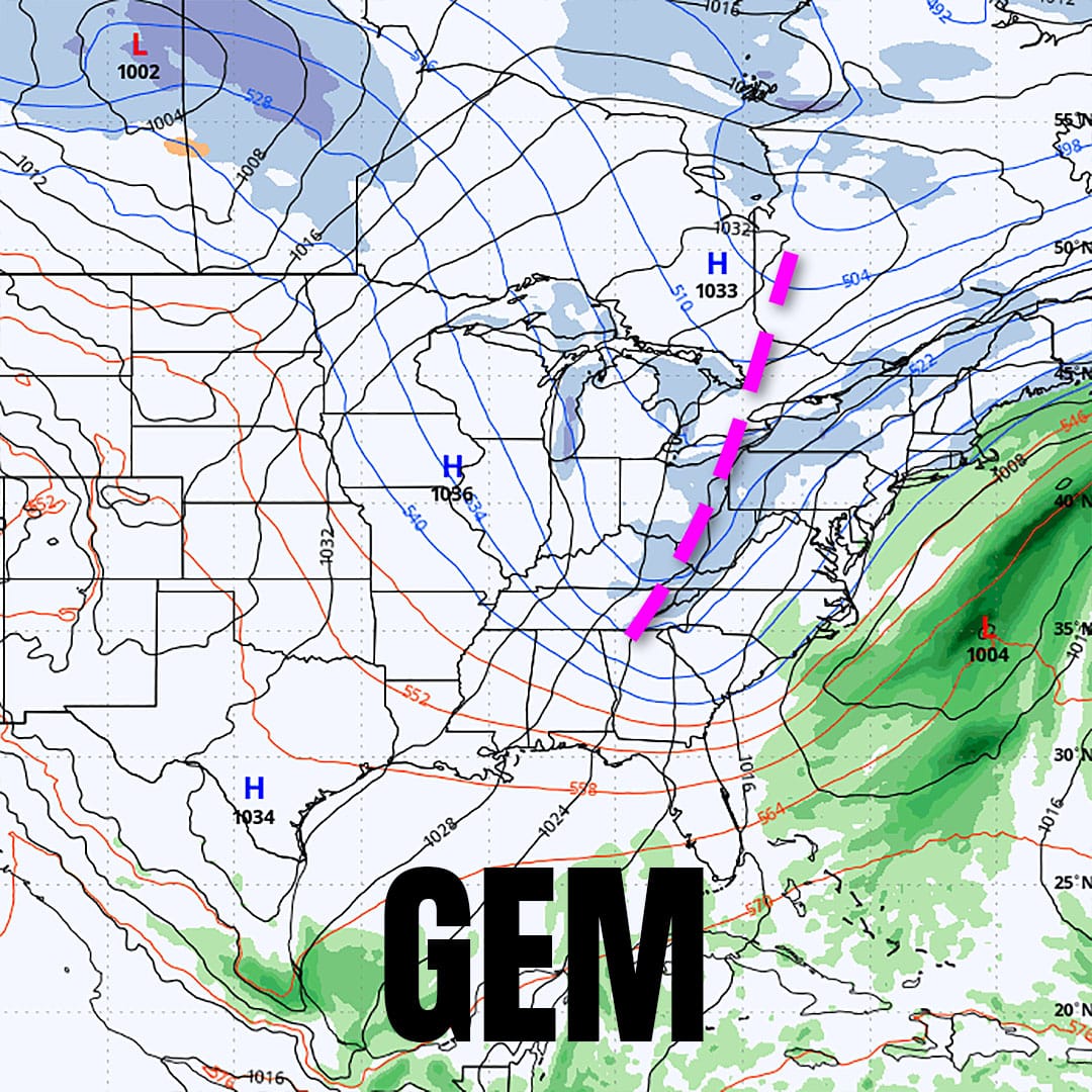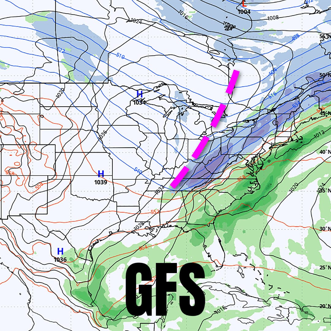 Shown above are the latest runs of the GFS (American), ECMWF (European), and GEM (Canadian) models showing 1PM on Thursday. The GFS and GEM both see a trough similarly and are roughly in agreement but the GFS sees light to moderate snow on Thursday and then a different piece of energy phases with the trough energy on Saturday and spins up near New England. This will likely change. The ECMWF is now seeing the trough pinch off an upper level low which changes the dynamic entirely and basically sends the storm out to sea with some back end snow. Behind that trough will be cold air and wind and an extended lake effect and upsloping snow event could come, and clippers do like to follow these systems as we recently saw with flow from the northwest.