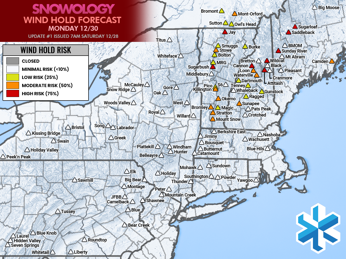 Wind hold forecasts confirm when access to +25% of non-beginner terrain limited or complicated for 2+ hours. On busy days this can also cause lift lines to back up, though I don't expect Monday to be that busy where wind will be an issue due to the r@!n. Lifts that reach near the summit are at the most risk and lower mountain lifts are rarely held outside of severe events or special circumstances related to terrain focusing the wind.