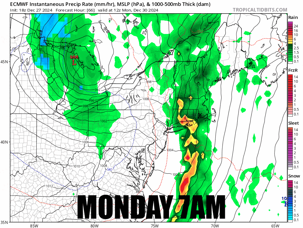 This update is really an addendum to the Weekend Outlook that was published yesterday. I have better guidance for the timing of the r@!n, and also some wind holds to look forward to on Monday that will mostly correspond with the r@!n. As always we'll start out with the wide view to set this up, this time from the ECMWF covering all of Sunday and Monday.