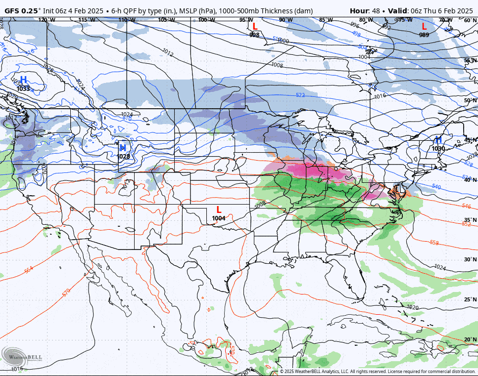 This isn't a big storm as far as moisture goes, but it does come in with a frozen mix in the southern half of the Northeast though quite a few are going to be saved from the frozen mix. There is also some back end snow that should occur off of both Lake Erie and on the upslope into the ADKs, Northern Greens, likely also Southern Greens and the NW side of the Whites. The snow is really starting to stack up nicely and that snowpack is now building in NH and ME as well, though corn season has set back in parts of PA, NJ, CT, and RI. Let's take a look at the broad view from the GFS covering all of Thursday and Friday.