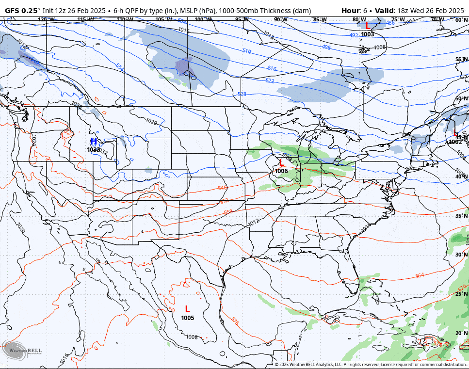 Winter is going to start clawing its way back on Thursday with a fairly weak system and a pretty decent back end along with some wind and some cooler temperatures. In combination with the warm up that we just experienced we are definitely going to see some hardpack develop where packed powder has been the rule of thumb for about 2 months with probably only a handful recovering decently by Saturday when the next storm comes in. Let's start off with the wide view as always, this time from the GFS covering 1PM Wednesday through 1PM on Friday.