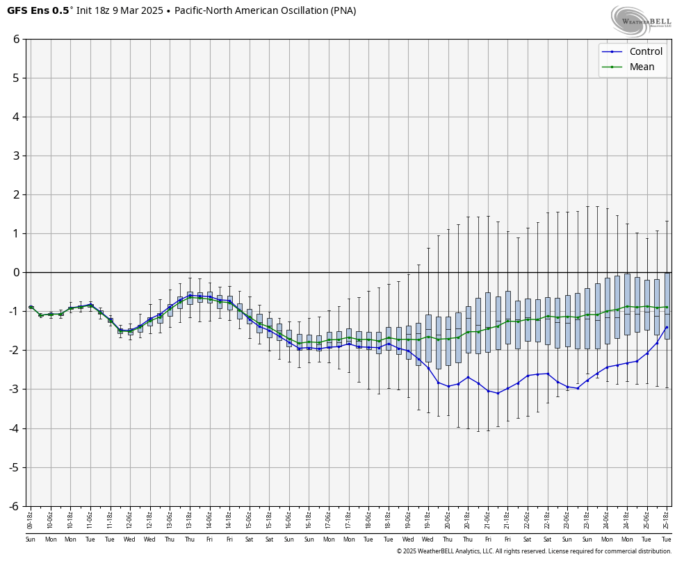 I want to point out the NAO- pattern which is also known as a Greenland Block. There's a lot of inexperienced forecasters point to this as a sign of big storms in the Northeast, but I'm afraid that it is not often determinative. It helps to enhance troughing over the Northeast but the pattern that is way more determinative is the Pacific North American (PNA) teleconnection because it is upstream from the Northeast. PNA basically measures whether there is ridging or troughing in the Gulf of Alaska and in turn that heavily influences whether there is ridging or troughing over the Northeast. After 2 months of persistent ridging over this area and troughing over the Northeast, that has now flipped to troughing over that area or a PNA- pattern and ridging over the Northeast. There isn't a whole lot of support for PNA+ coming back until at least late March, though the GFS Ensembles are pretty much saying "screw that, I'm out of here."