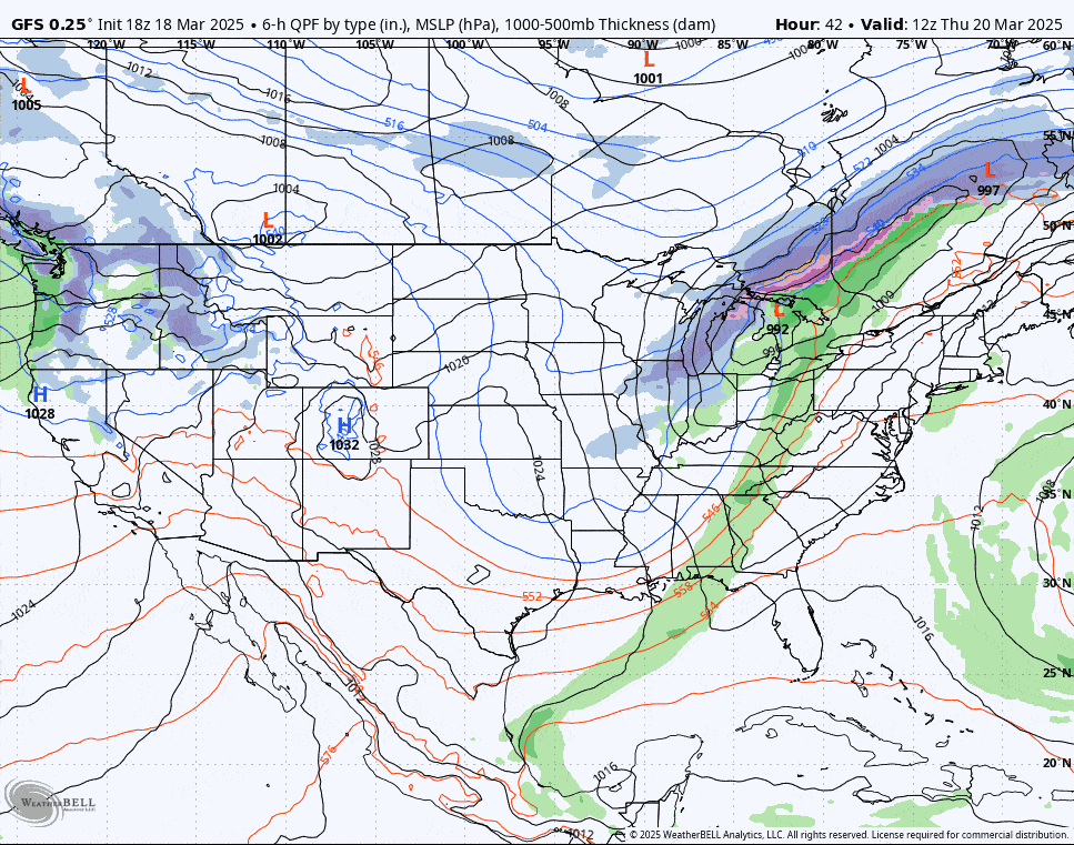 All three major medium range models are in general agreement from the bird's eye view, but it's the small differences that will determine how intense the storm will be and you can't really guess accurately from 3 days away. Here's the broad view from the latest run of the GFS covering 8AM Thursday through 8AM Saturday.