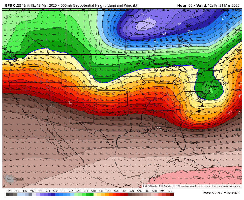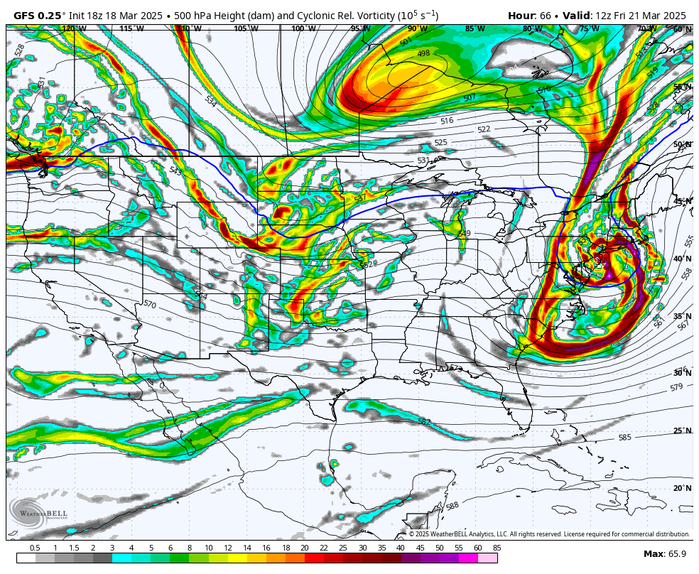 The issue is that the storm is forming on a low level jet at the leading edge of a trough and there is energy both to the NNW and to the south of where this storm will be and storms are weakened by these other pieces of energy as it obstructs flow and makes the circulation less tight. Models are still having issues sorting out the degree of dominance of the main storm and the energy south rounding the trough and in recent runs some have seen the storm pulling south for a bit after it forms near NYC which is atypical. This 500 mb vorticity map from the GFS shows the two loops of energy with our storm being the one inside of the loop.