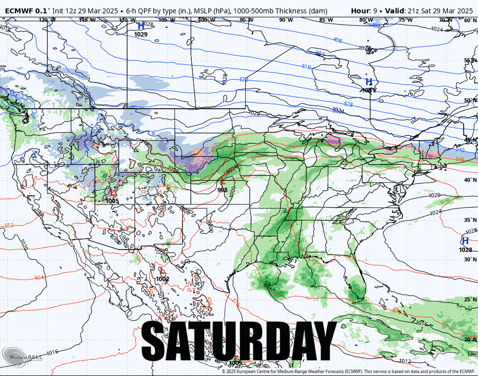 We did pretty good by our final update last night with the nudge south, and that was just enough to bring pow days (+6") to about another 10 ski areas. Hope you got some today because the pow is over early this evening and the r@!n, freezing r@!n, and sleet are all that is left through Monday, but there will be some dry areas with spring skiing and riding, and the sleet skis just great though there are just 9 open ski areas that fit into this category. We'll start with the broad view showing 5PM Saturday through 5PM Monday from the ECMWF.