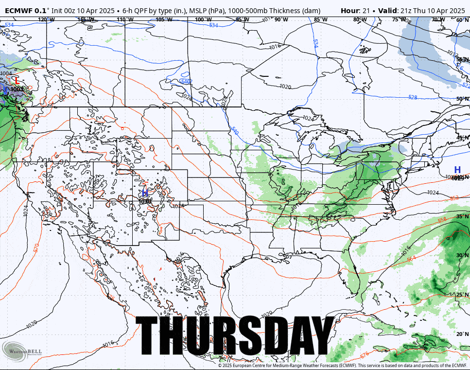 I'm going to show the ECMWF for the broad view covering the 5PM Thursday through 5PM Sunday timeframe as this is both the more conservative of the top two medium range models and I happen to think it is most likely to be correct.