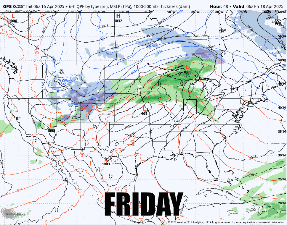 Here's the broad view from the latest GFS showing Friday through Sunday with 6-hour precipitation intensity (which will make it look more r@!ny than it really is).