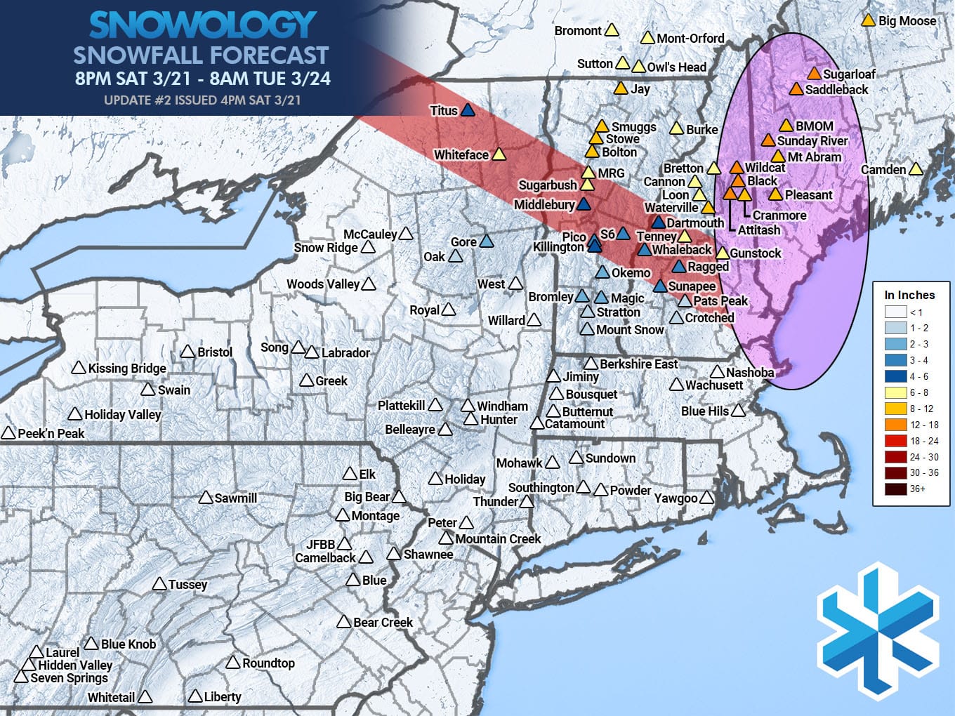 Keep in mind that this map covers through 8AM on Tuesday and after a lull of about 18 hours with only very light snow in the northern reaches we'll see a deformation band develop in Northern New England that we expect will drop up to 4" in isolated areas starting around noon on Monday and tapering off in the early morning hours of Tuesday which will provide a nice refresh.