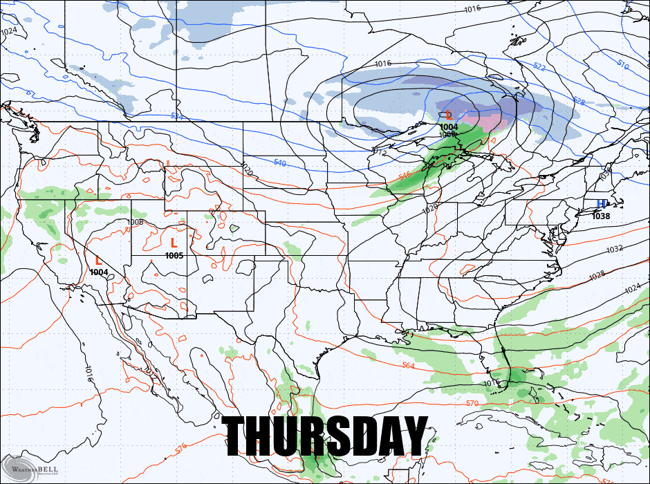 So here's your preview for Thursday through Monday of this week from the GFS using 3-hour precipitation intensity (which broadens focused precipitation like fronts but less so than 6-hour precipitation intensity maps).