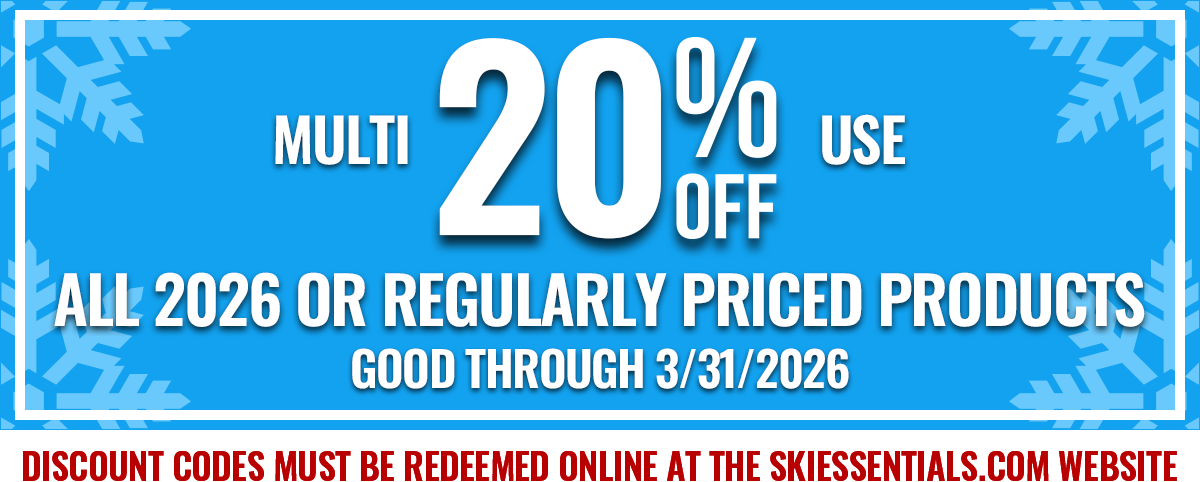 The following coupon code can only be used online at SkiEssentials.com for any 2026 or regularly priced products. The discount will automatically apply to all qualifying items your cart however they cannot be stacked with any other specials they may offer. The coupon is limited to 5 uses.