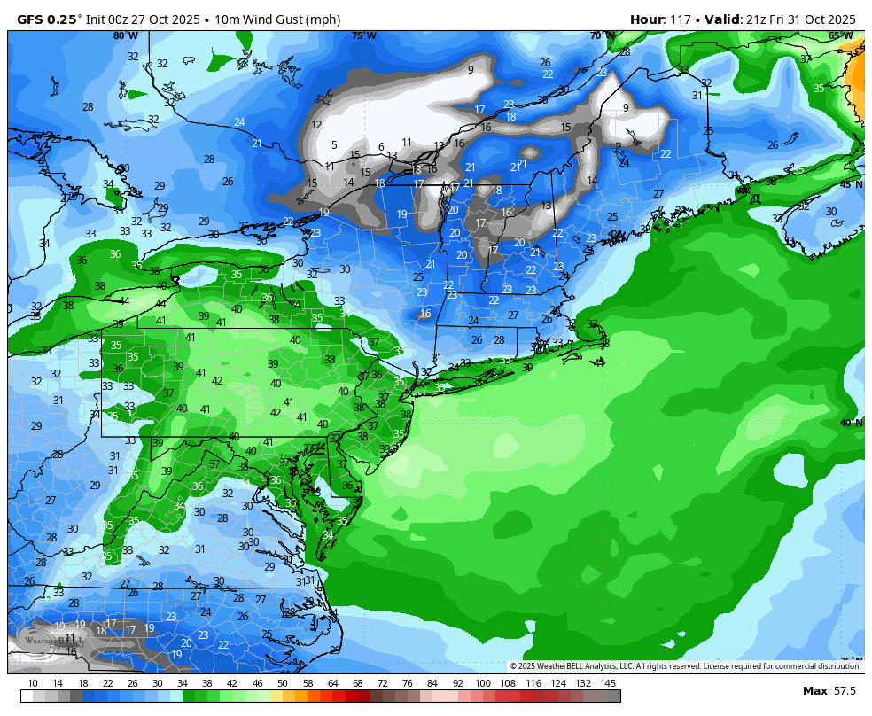 So far this looks mainly tolerable, though damp following r@!n earlier in the day, but as that low tracks northeast wind will switch to coming from the west to northwest and it looks quite brisk. Here are the modeled wind gusts at 5PM again on Halloween:
