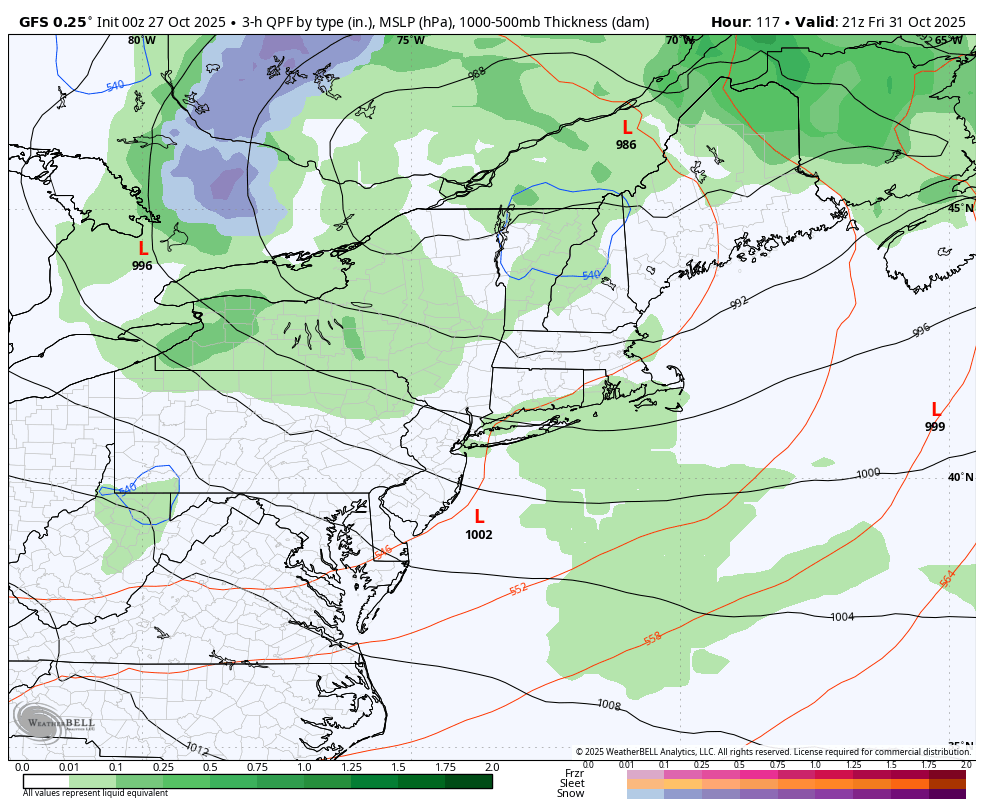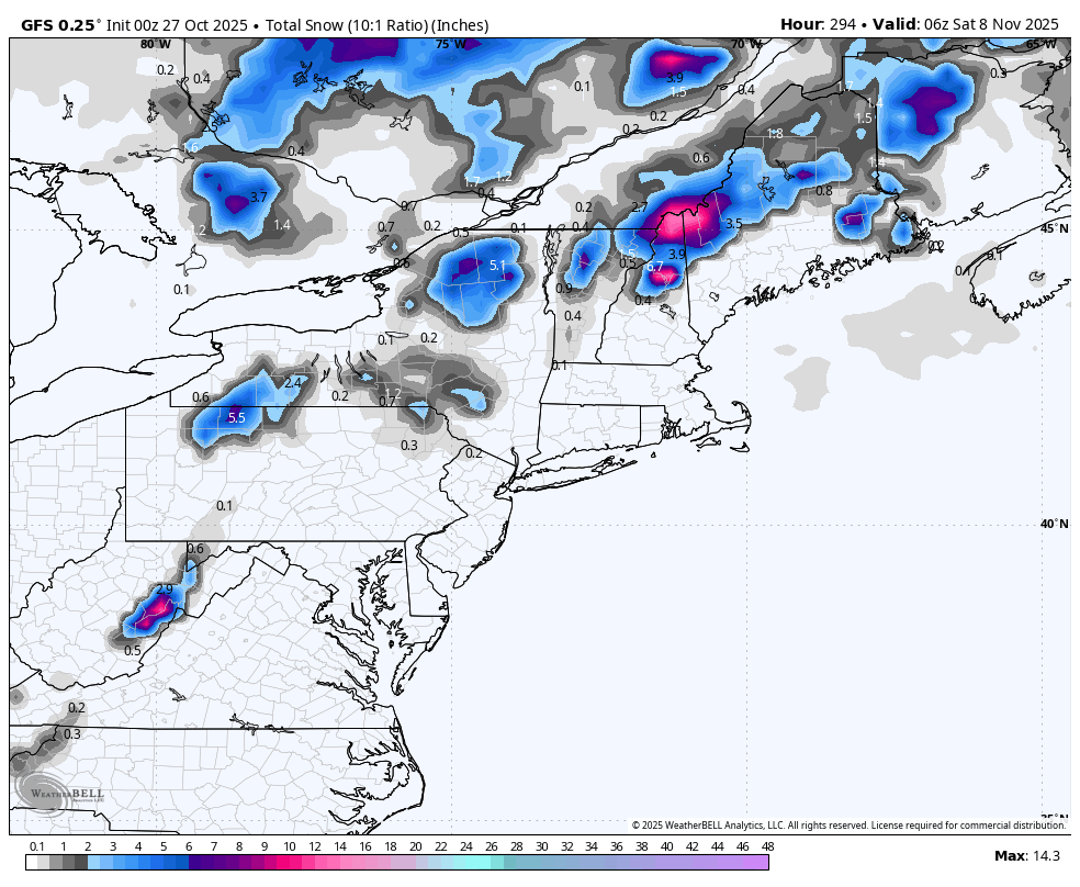 There's no reason to get any deeper in the synoptics (large scale patterns) for Halloween. There might be some snow on the higher elevations of WV, PA, and the northern parts of NY, VT, NH, and ME, but that's not prime trick or treating territory of course and it won't be enough to ski just yet (unless you are hardcore AF). If it does track closer to the coast we may see snow further south in the Catskills and Southern Greens as well though.