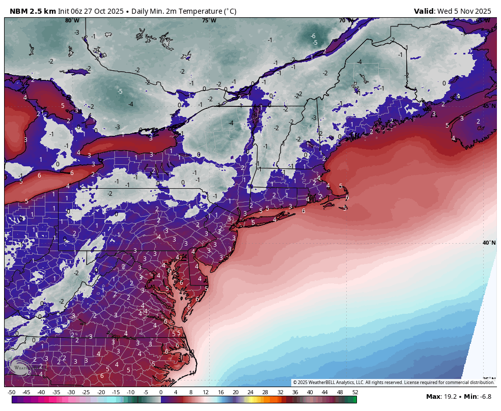 I ain't going to lie, I would like to see something dig deeper and form a storm further south for more cold, but this might just be enough to get the snowmakers out of bed for the first time this season. Here are the low temperatures for Wednesday the 5th and Thursday the 6th according to the National Blend of Models: