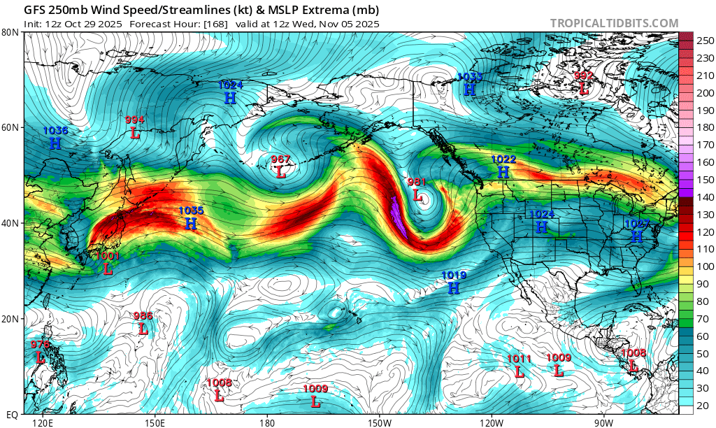 I am seeing some improvements in the 'Screaming Pacific Jet Stream' that we want to see become more wavy and hit the West Coast a bit more slowly. This shows the Jet Stream winds next Wednesday morning for instance.