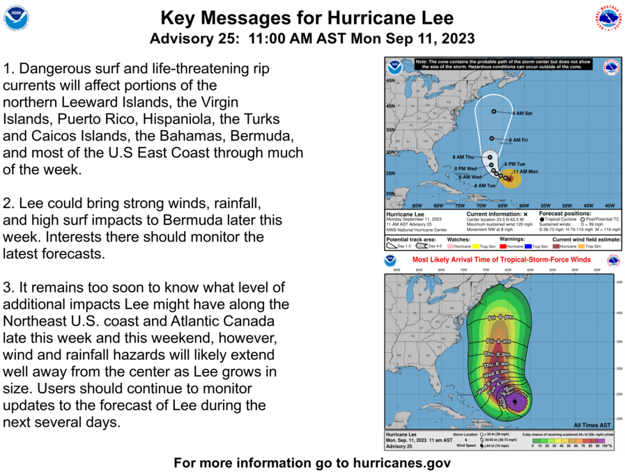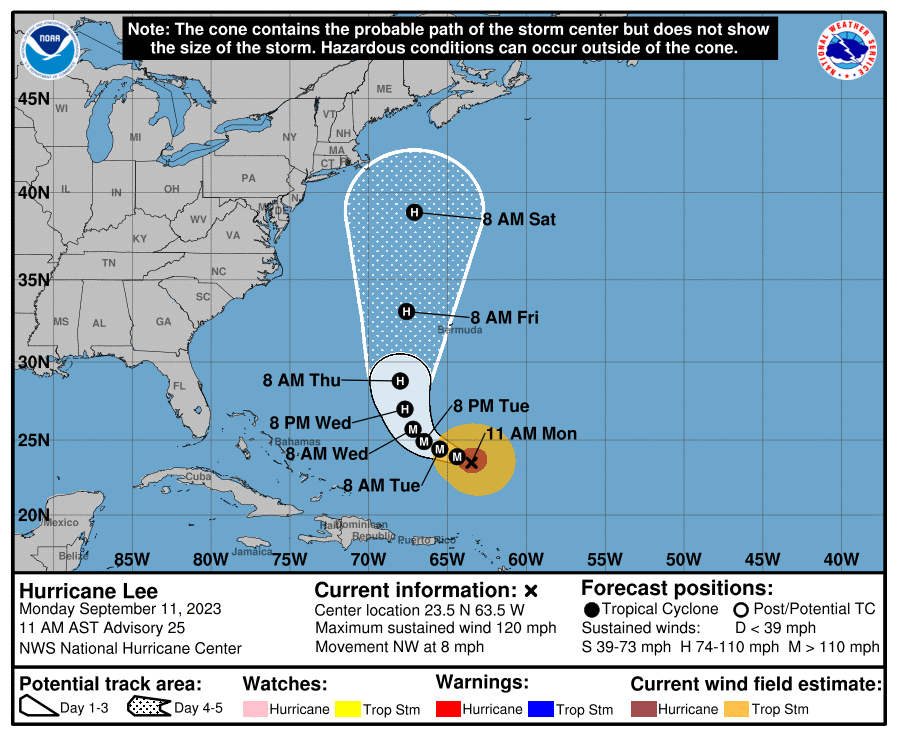 The NHC forecasts out 5 days (120 hours) which brings the forecasted center of the storm approximately 350 miles due east of Atlantic City, NJ. More of the NHC's forecasting and guidance can be found on their Hurricane Lee page. They update every 6 hours starting at 5 a.m.
