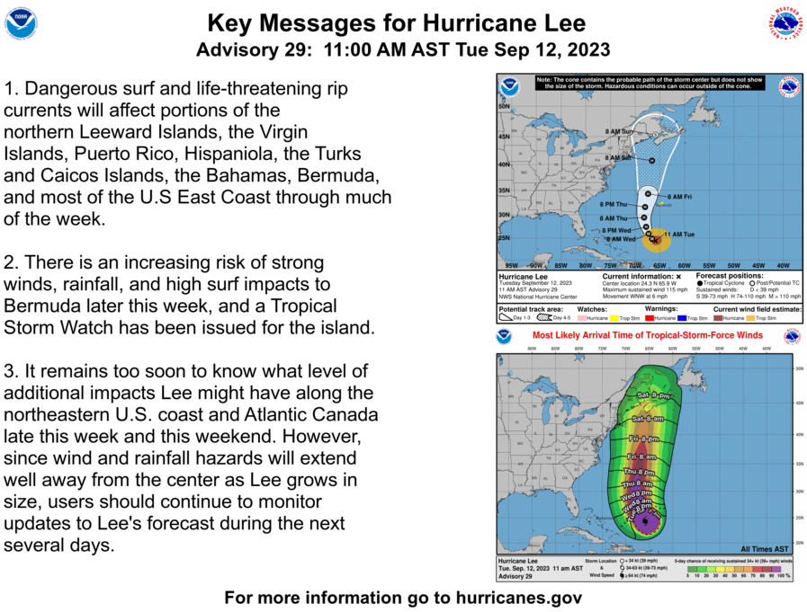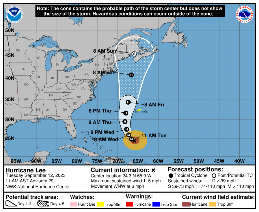 Today the NHC's Track Forecast Cone has reached the Maritimes by Sunday at 8 a.m. showing a weakening from minimal hurricane strength with 75 mph winds 24 hours earlier to 50 mph winds and tropical storm strength. The cone does reach Cape Cod and envelops practically all of Maine, New Brunswick, and Nova Scotia where the NHC's forecast track currently favors landfall. The Track Forecast Cone is designed to show enough variability that the storm will track within the boundaries 2/3 of a given time. More of the NHC's forecasting and guidance can be found on their Hurricane Lee page.