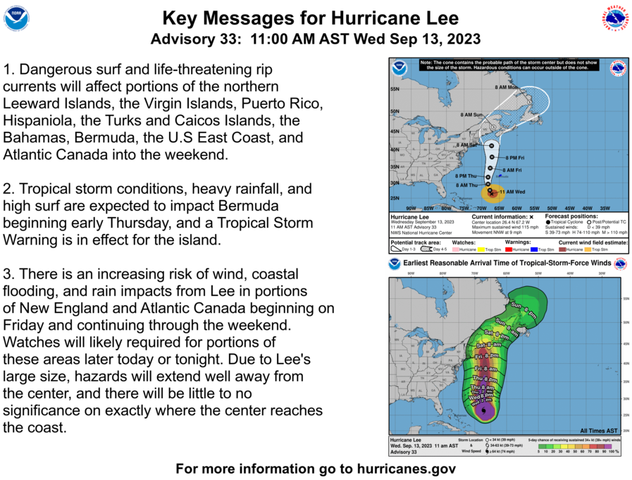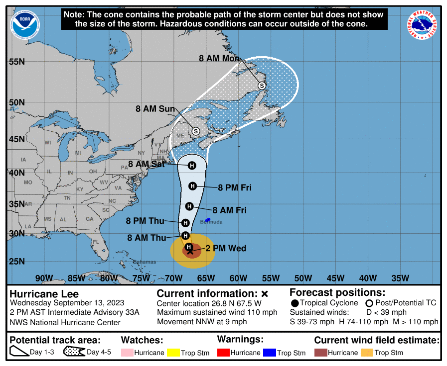 We're starting to get into the higher confidence 72 hour zone approaching the Gulf of Maine in the NHC's Track Forecast Cone by Saturday at 8 a.m. The NHC now expects maximum sustained winds of 80 mph Saturday morning as the storm starts to undergo extratropical transition at a latitude near even with NYC. By Sunday morning the storm is expected to be over New Brunswick with sustained winds of 60 mph before it races off to the Northeast. More of the NHC's forecasting and guidance can be found on their Hurricane Lee page.