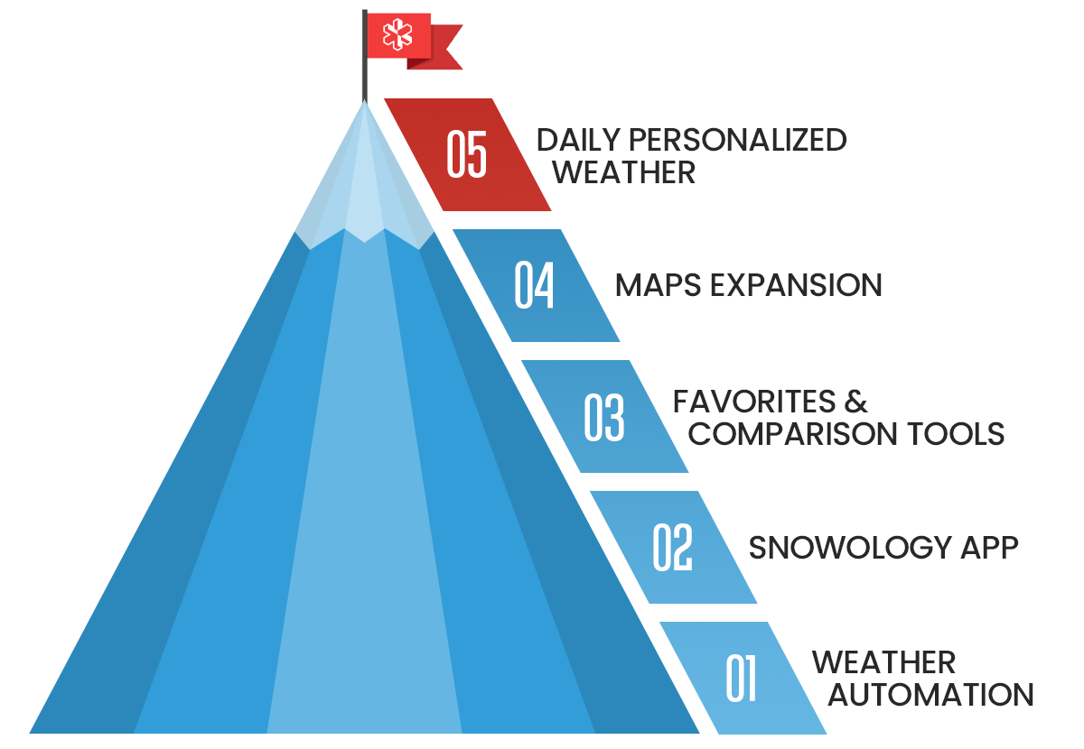 Imagine finishing dinner at 7PM and you get a notification on your phone and/or an email alerting you to the next 3 days of weather with detail about your 5 favorite mountains along with maps, simulated radar, and an overview of a coming storm. That's our vision for what will happen by the start of next season.