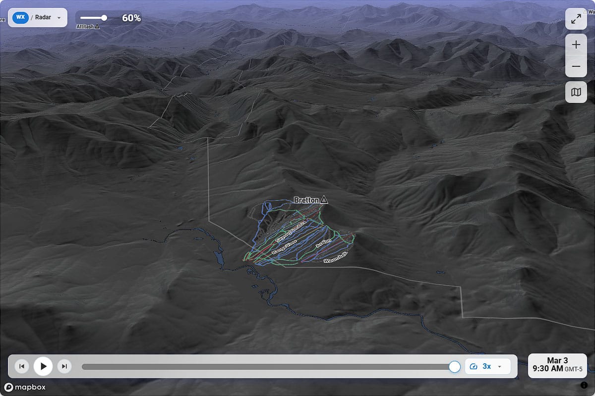 We previously announced that we had added markers and labels for every ski area in the East Coast as well as the depiction of lifts and trails along with terrain, all you have to do is zoom in close enough and these things will appear automatically on the maps. You can also change your viewing angle and see terrain in 3D by holding down the Ctrl key and moving your left mouse button on desktop, or on mobile by using two fingers at a time and moving simultaneously.