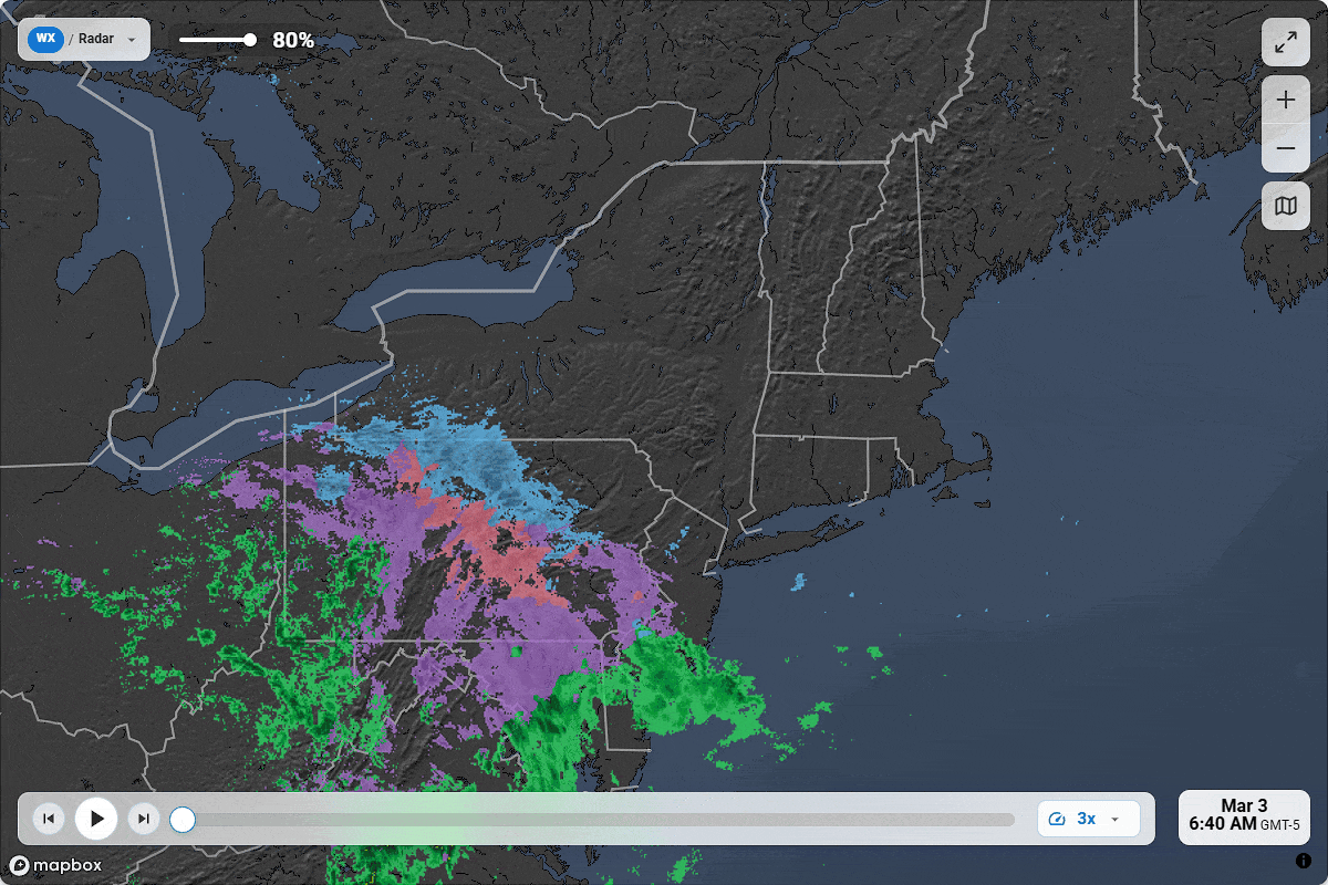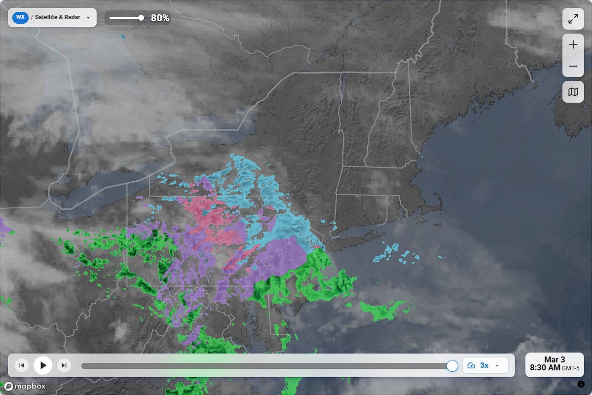 All composite radar in North America is built from publically available data from the National Oceanic and Atmospheric Administration (NOAA) and the Meteorological Service of Canada (MSC), however they do not break down precipitation by type and the raw data is sometimes noisy. Our radar is sourced from The Weather Company who also supplies radar to Weather.com and WeatherUnderground, and we know from experience that it is the most accurate when it comes to estimating precipitation types and also for cleaning up artifacts. In elevation storms it tends to be hyper accurate, however in inversion type systems such as the one impacting the Northeast today with warm air overriding the cold it can run a little colder in presentation at times, yet still significantly more accurate than any other product we have reviewed.