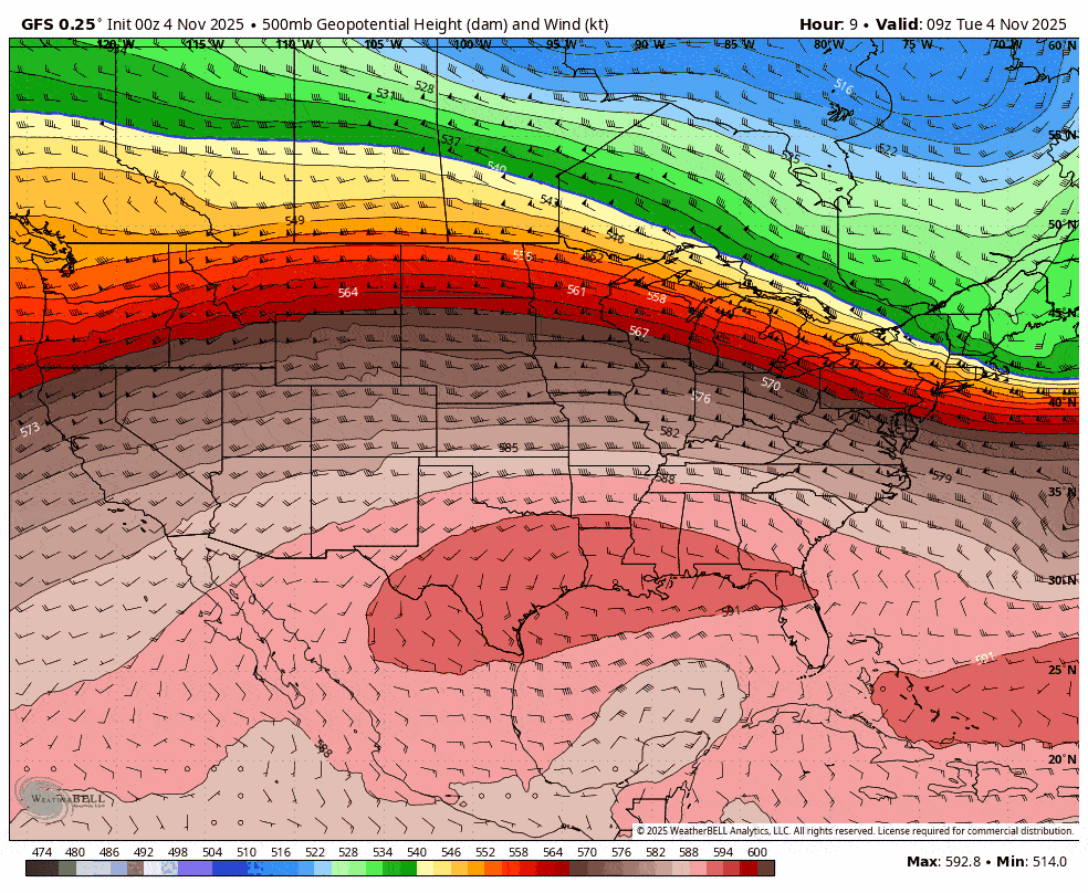 We're going to see a pattern change this weekend. Currently we have a train of fast-moving storms from the WNW, to semi-persistent troughing in the East. I'm going to use the 500 mb pressures to demonstrate this. This is where the primary steering flows are for storms and the Polar Jet Stream tend to be just south of the green areas. This loop covers the next 10 days.