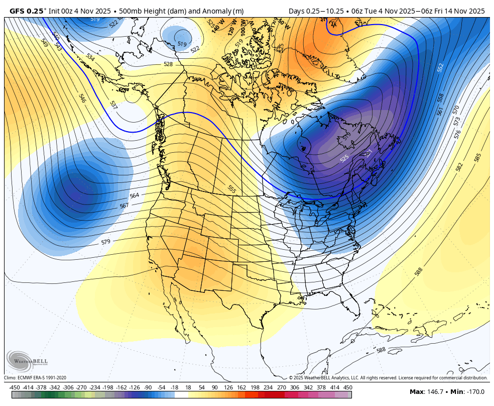 What is missing from this being optimal for the Northeast is the absence of strong low pressure over the Hudson Bay which helps create troughing and cold for us. While GFS is hinting of that starting to form mid-month, there's absolutely zero consensus among longer range models. I do not currently have an opinion on what the last half of the month will bring in terms of temps.