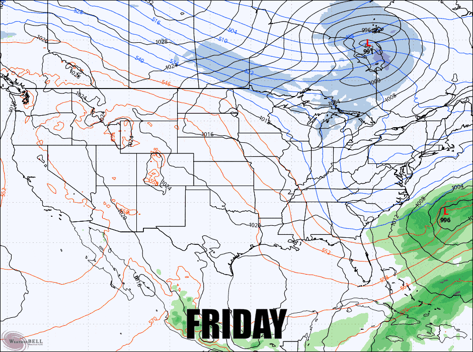You might also notice the isobars building a ridge in the center of the country. This looks like a pattern change to me, not necessarily a flip but a change to an active weather pattern with more storm potential and some warm to cold cycling in the Northeast. This should also help the West finally get some snow starting in about a week.
