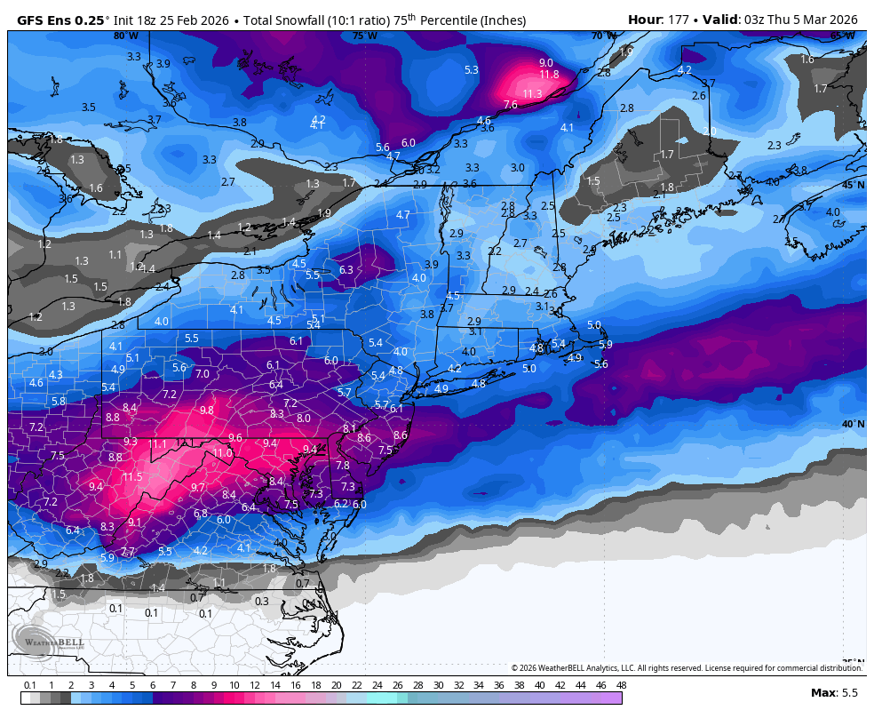 At this range I like to use the GFS ensembles at the 75% percentile for snow, which basically means the top 25% of members. This helps correct for averaging the peaks down to give you a better idea of snowfall potential. Currently that is focused though on the Mid-Atlantic but that can definitely shift north or south. Just 18 hours earlier the GFS ensembles were more amped and about 200 miles north in focus. It's likely that the more north this is the more amped it will be because that involves more interaction with the Northeast trough than a southern track. This snowfall map from the GFS ensembles does cover a full week of snow from now through the end of next Wednesday, though it is at 10:1 ratios and lower amounts are still averaged down but this gives a good picture of where the ensemble sees the focus of the potential Monday wave.