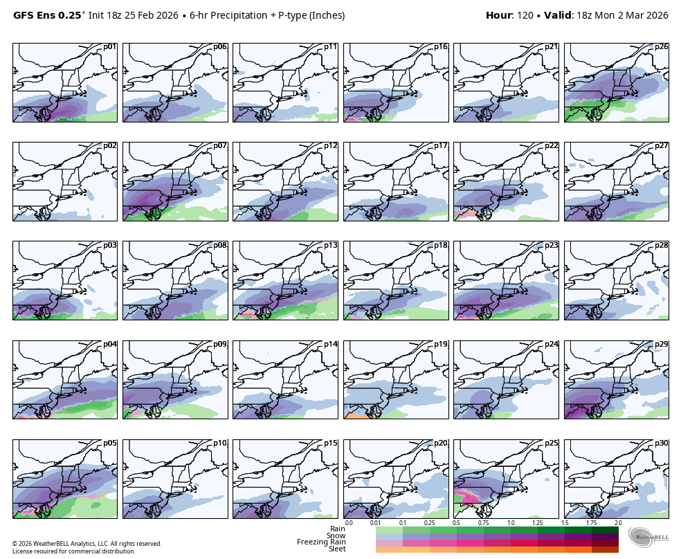 Focusing in on the Monday pulse as the GFS sees it, the ensembles have been in strong agreement for a couple days now on there being a slider somewhere in the region. This is what the GFS ensembles see for 1PM on Wednesday.