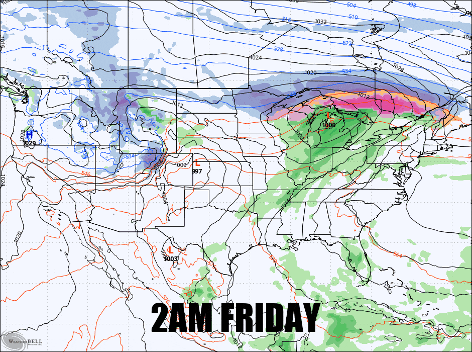 Let's jump right into the broad view from the GFS with 6-hour precipitation intensity (this is different from simulated radar as it shows precipitation over a 6-hour window in each frame).