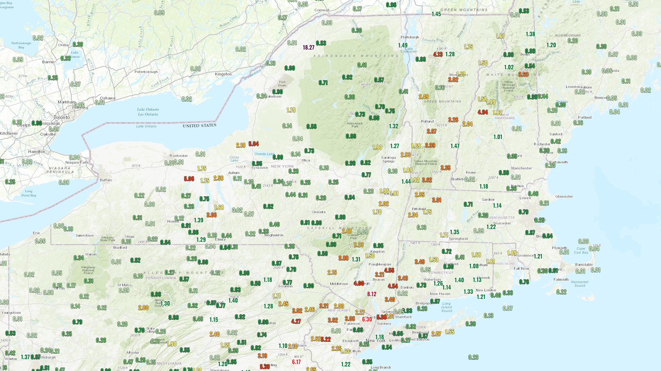 Slow moving moderate to heavy rain has dropped over 9" on some parts of New York causing notable flooding last night in the lower Hudson Valley. As of this morning widespread flooding is now also being seen in Vermont where VTDigger is reporting that 19 people had to be evacuated from their homes by boat this morning. Other flooding issues were also seen in parts of Pennsylvania, New Jersey, Connecticut, and Massachusetts. Rainfall totals from Saturday through 2 p.m. on Monday are shown here: