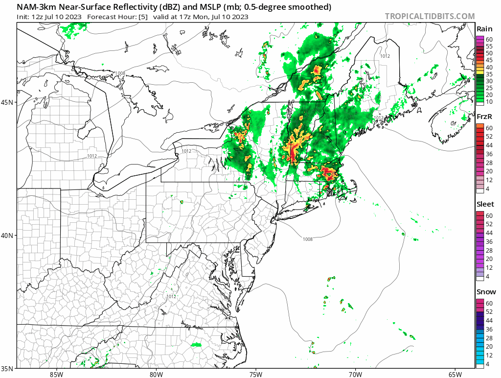 These rainfall totals mostly come from the valleys, however upsloping into the mountains will enhance the rain by 50% or more in many cases, so we have already likely seen over 5" of rain on parts of the Greens with more to come tonight. This simulated radar loop comes from the NAM3K and covers noon Monday through noon on Tuesday.