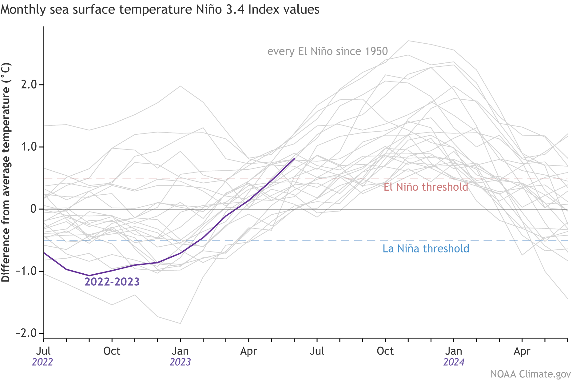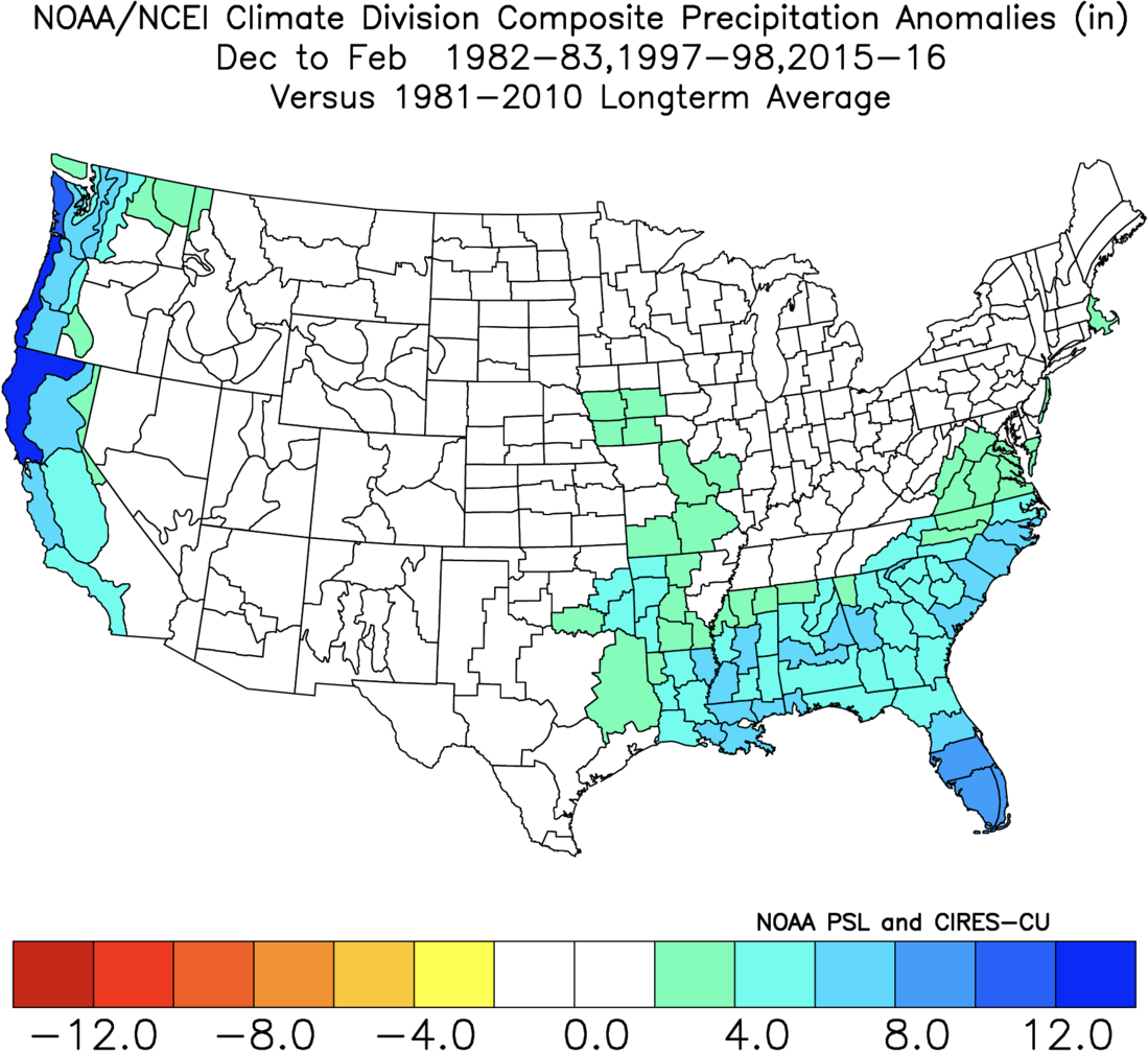 We are already in an El Nino with sea surface temperatures in the associated region already rising 0.8C above average, however this won't be officially declared until these anomalies are found in 5 subsequent 3 month periods, which is practically a formality at this point. ENSO extremes (El Nino and La Nina) have clear influence on large scale weather patterns. These influences are stronger in the west than in the east due to proximity and exposure to other large scale patterns, and the stronger the El Nino or La Nina, the more influential these patterns can be. We seem to be on our way to a Strong El Nino or possibly another Super El Nino like we saw in 1982/83, 1997/98, and 2015/16.