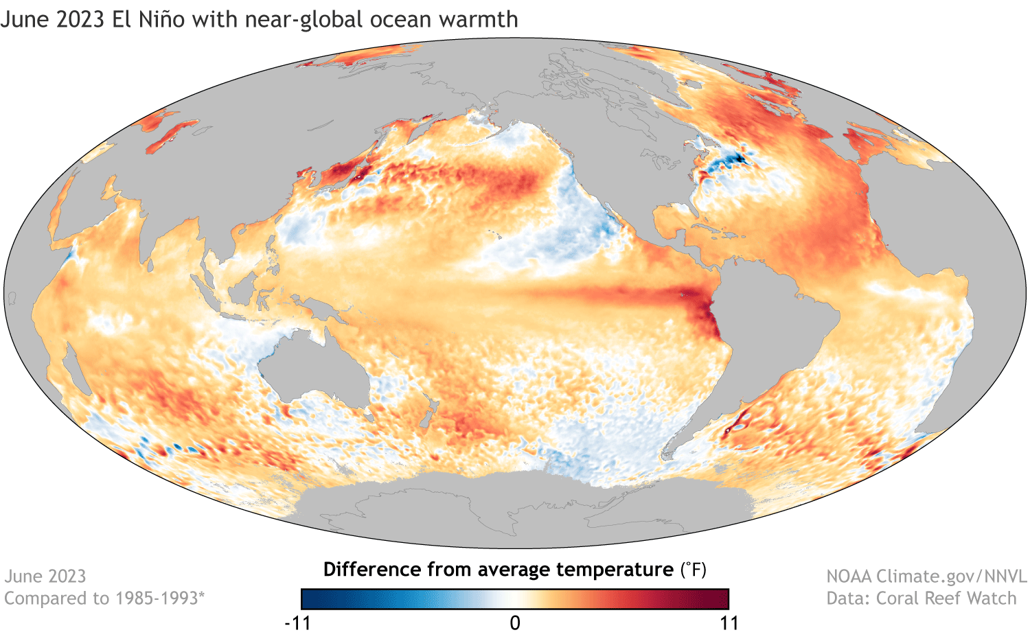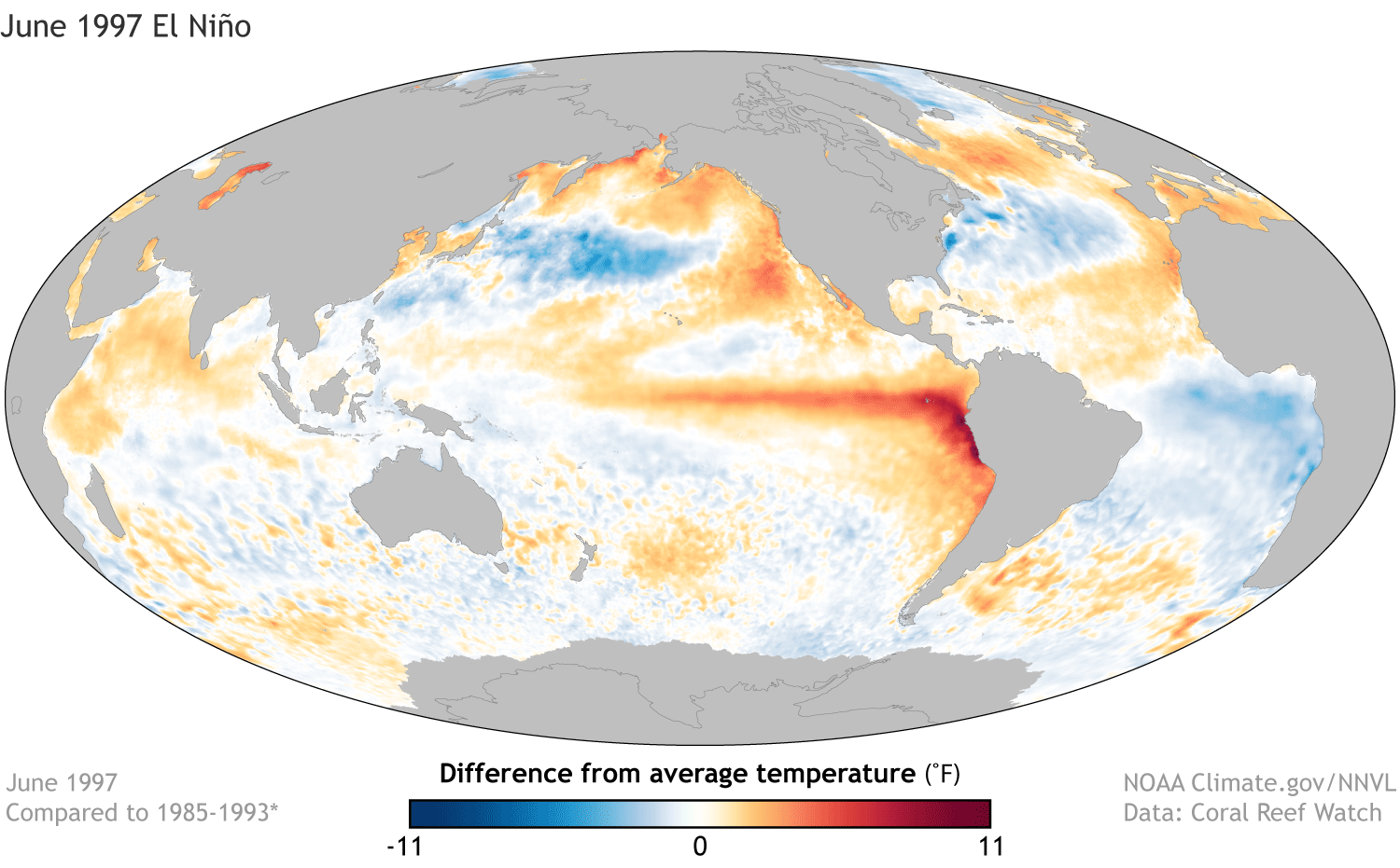 There are however some good arguments against this resulting in a terribly warm pattern for the Northeast next winter. As indicated above, we only have 3 analogs for a Super El Nino and that sample is too small for high confidence. It's reasonable to assume a warming influence on the Northeast, but how warm that influence might be is still an open question. The other argument has to do with how warm the water is in the Nino-3.4 region in comparison to the rest of the globe. If everything warmed by 2.0C, would that cause a change in weather patterns? NOAA explored this very question in the latest ENSO Blog. With the oceans warming to an extreme all over the globe creating less relative temperature differences, maybe what we would consider to be a Super El Nino due to temperatures in the Nino-3.4 region has much less influence over weather patterns when we are seeing warmer than average sea surface temperatures all over? They provided examples of the 1997 Super El Nino and the current sea surface temperatures to demonstrate how this El Nino may in fact be different from past strong events and the influence on weather patterns possibly being more "muddled".