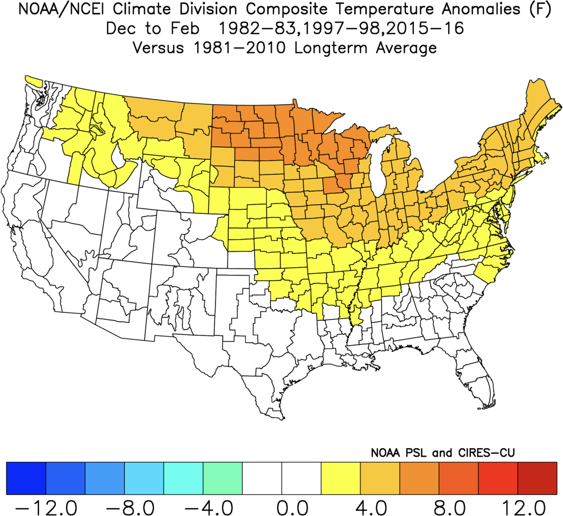 There's probably no stronger analog than a Super El Nino where temperatures in the Nino-3.4 zone of the Pacific reach a 3 month average of +2.0C. We've only recorded 3 of these events precisely, 1982/83, 1997/98, and 2015/16. If any of those winters stand out to you, that would not be a surprise; they were memorably awful in the Northeast. The stronger the ENSO extreme, the stronger the influence is on our weather. The following two graphics show the departure from the 1981-2010 averages for the 3 Super El Nino events. A Super El Nino seems to have a high probability of a very warm winter for the Northeast due to the effects on jet streams and weather patterns, but with only 3 of these events recorded there is a possibility that the effect is overstated.