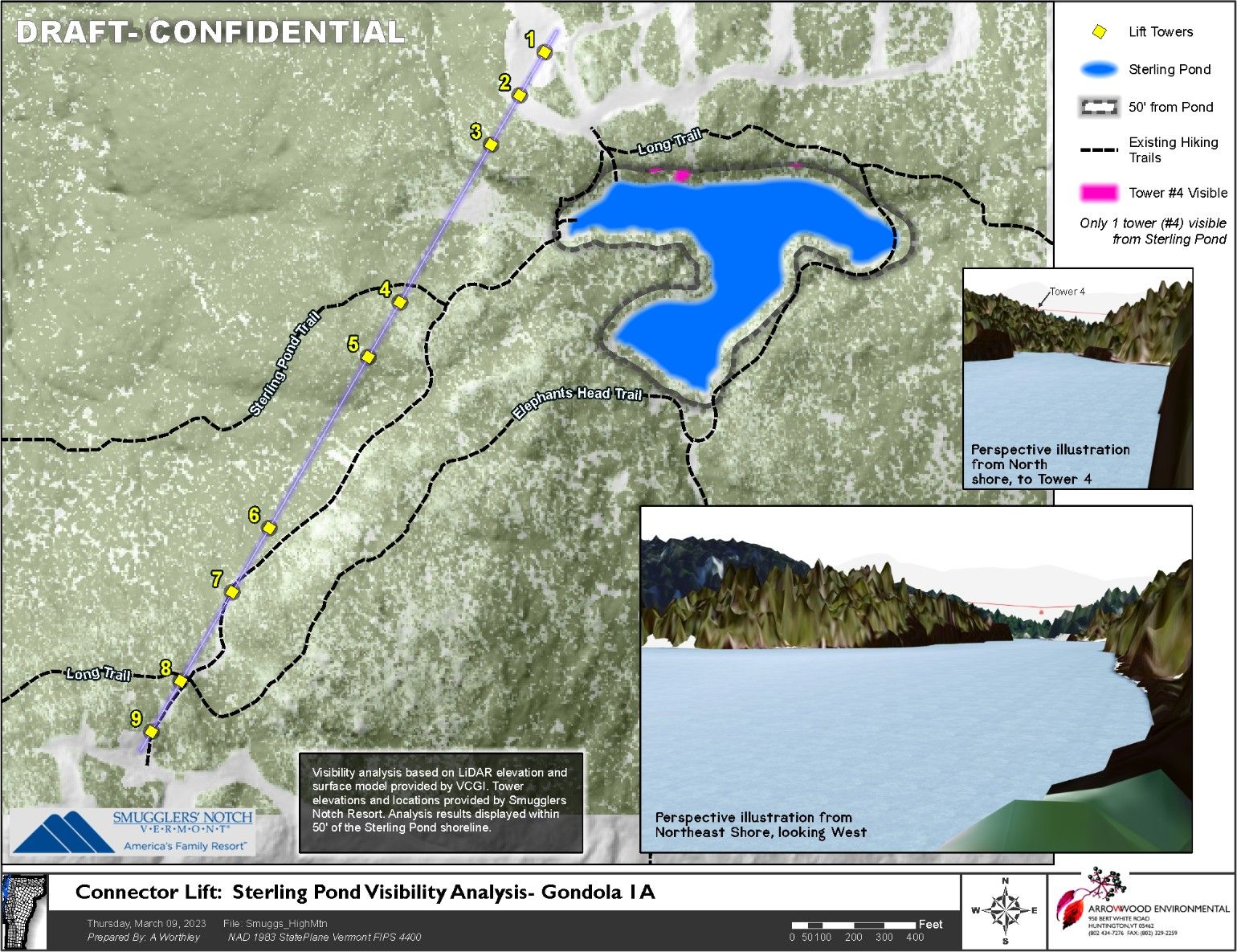 During that March 13th meeting representatives from Smugglers’ Notch and Stowe presented a new proposal for a gondola instead of a chair lift with a new alignment to avoid some sensitive areas and far less ground disturbance. Instead of needing to clear cut a 50’ wide berth for a chairlift requiring the removal of all trees across the 2,626’ long lift path, they opted for a much more expensive gondola that would only require 5’ of clearance between the trees and the bottom of the gondola allowing it to pass over the top of mostly undisturbed vegetation. Construction would only disturb a 25’x35’ near each tower which they believe could be re-vegetated, and only selective felling of larger trees from a narrow path would need to be removed. The original design had a chairlift passing very near the edge of Sterling Pond with a terminal near the very top of the Sterling lift at Smugglers’ Notch side, but that has been shifted west and downhill in order to better avoid watershed areas. Copies of the design proposed at this meeting do appear with this article. Smugglers’ Notch worked with SE Group, Doppelmayr, and Arrowhead Environmental on the engineering, studies, and proposals.