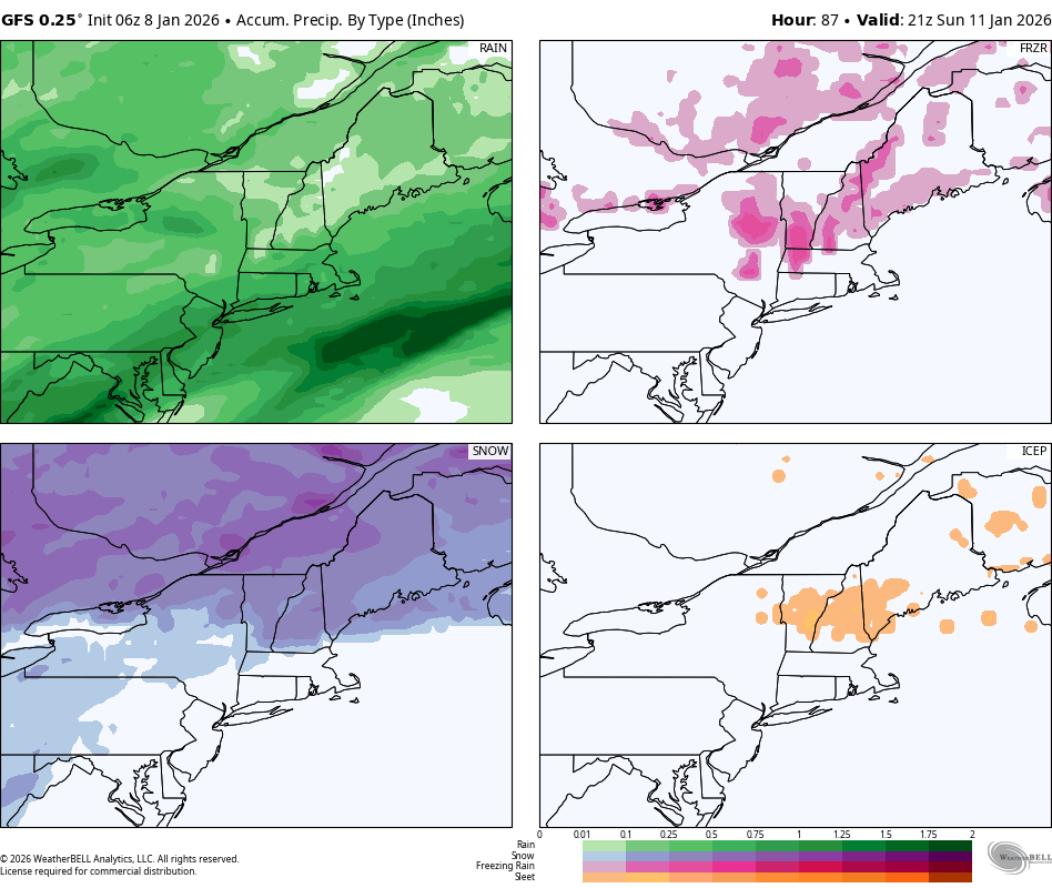 There will be good skiing and riding every day in the Northeast, but not in one place all three days. This is what the GFS currently sees through Sunday at 4PM in terms of the 4 main types of precipitation.