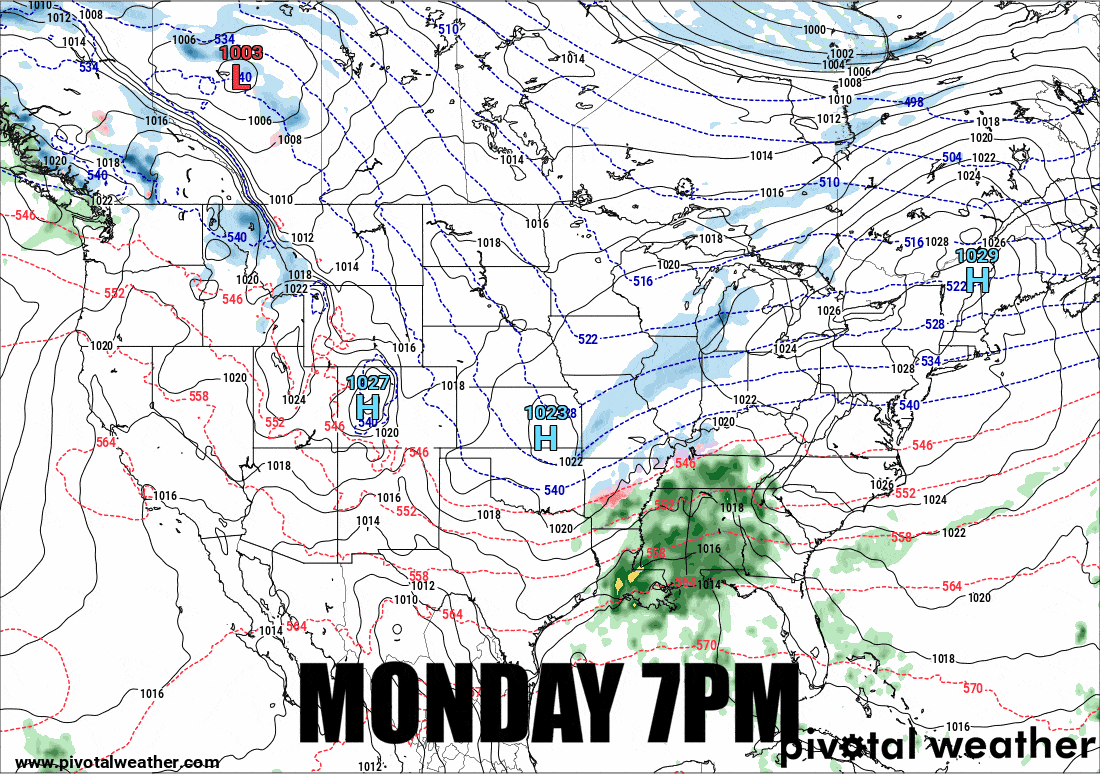 So let's look at the broad view covering 36 hours from Monday at 7PM through 7AM on Wednesday from the GFS.