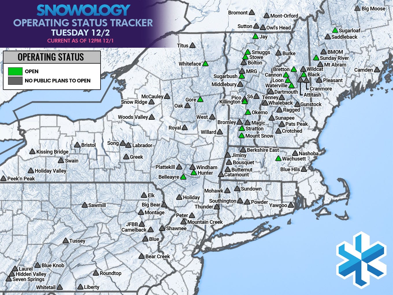 Here's the updated Operating Status Tracker for today. Both Greek Peak and Jiminy Peak were incorrectly listed yesterday as being open. Keep in mind also that Black Mountain will close after today and open on Fri-Sun until sometime in mid-December, but my guess is they might open on powder days midweek if we have another one.