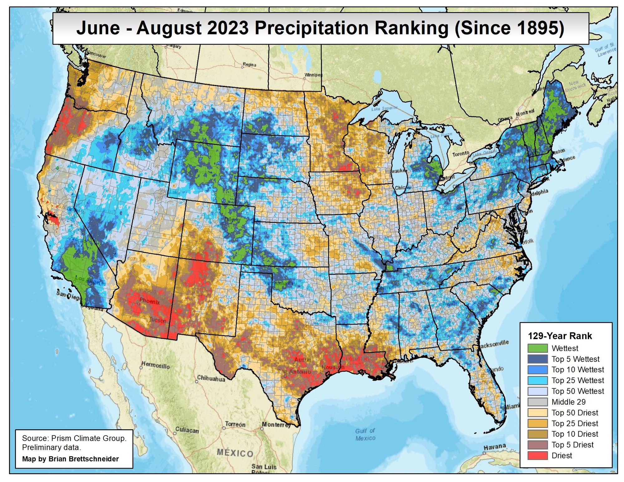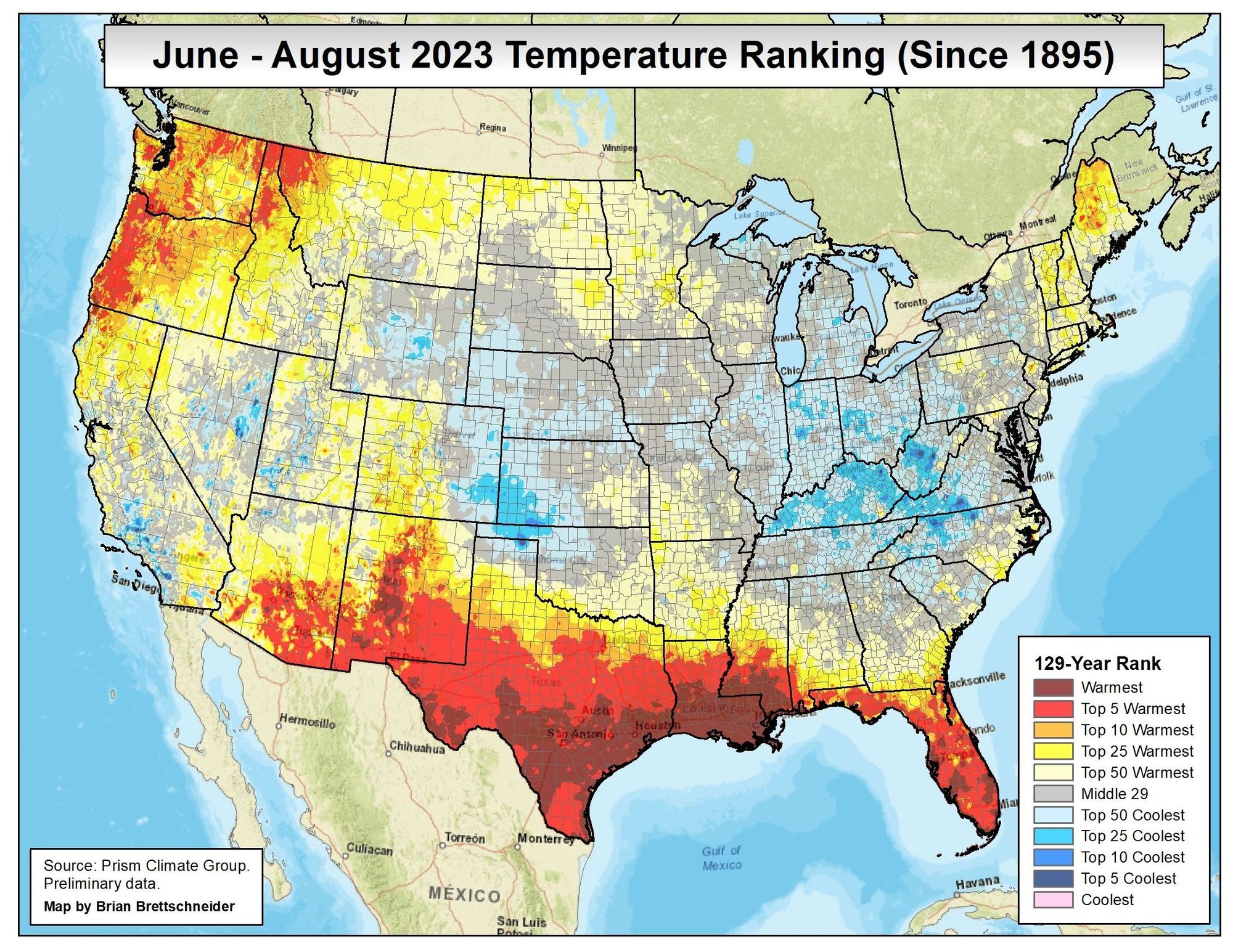 Thanks to Climatologist Brian Brettschneider we have some more detailed maps based on the same data used by PRISM Climate Group, but this time with rankings based off of records going back to 1895. PRISM's maps have more smoothing than these do, but the added detail can create more noise from individual stations and as always mountainous areas have less accuracy because in many cases temperatures and precipitation are interpolated from nearby ground measurements.