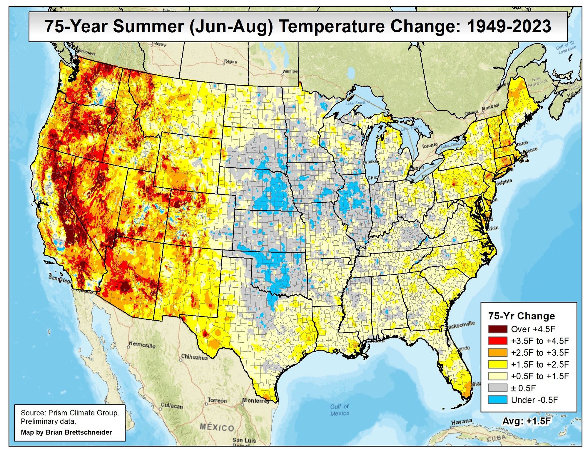 We have another nifty map from Climatologist Brian Brettschneider showing how temperatures have changed during the summer months over the last 75 years. The West is rapidly warming during the summer which may be related to the mega drought with less clouds, while the East is warming less severely, but the Northeast more so than the Southeast for reasons described above.