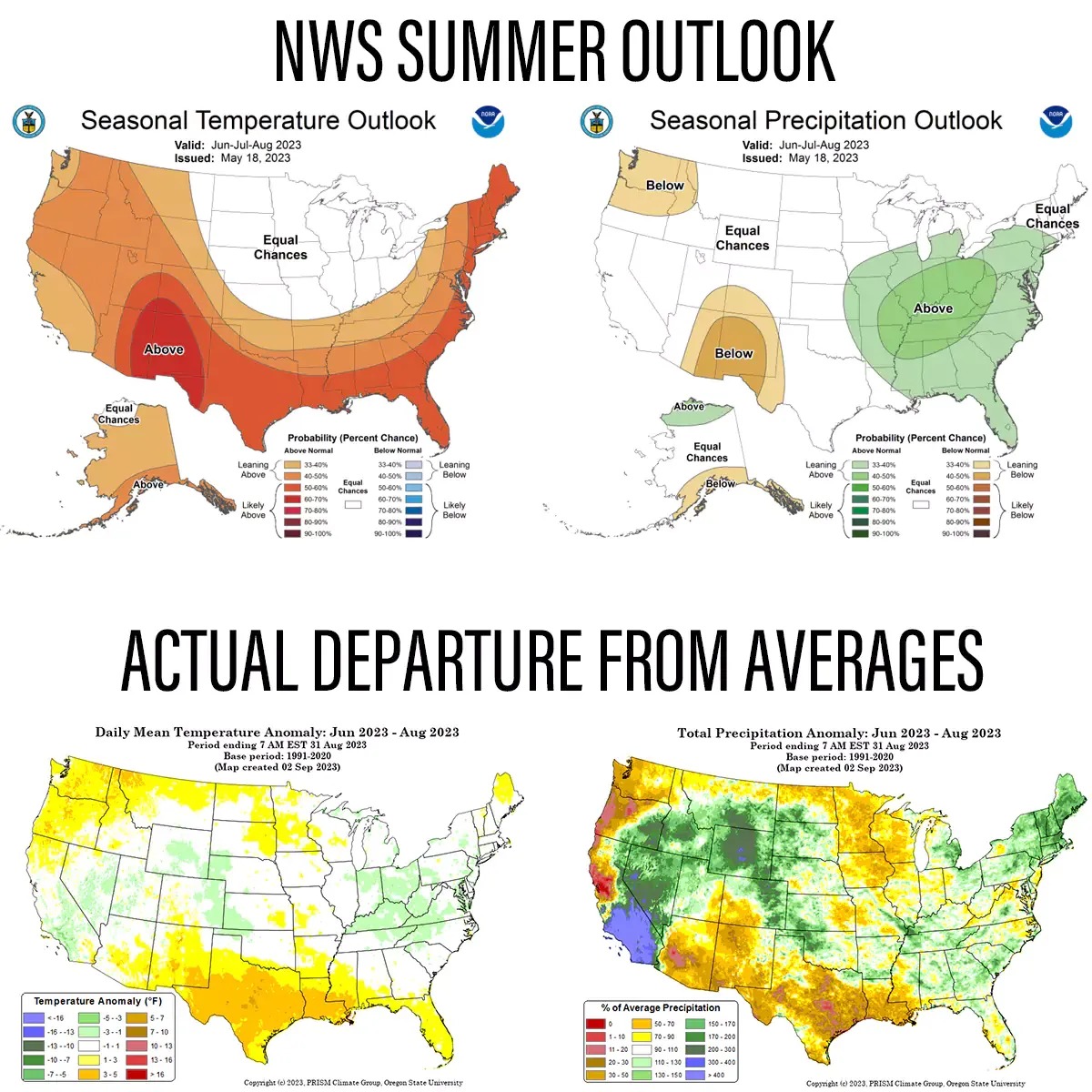 With summer over we can also look at the climate record and see how forecasts compared to results. The following graphic shows the NWS Climate Prediction Center's (CPC) forecasts for the summer issued in May, and then the actual results as computed by PRISM Climate Group compared to the climatological averages from the 1991-2020 period.